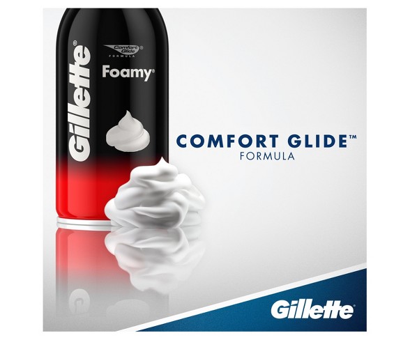 Description Gillette Foamy Shaving Cream produces a thick shaving foam that lasts your entire shave and delivers a smooth, comfortable shave every time. This Gillette shaving cream gives you enough foam for at least 52 shaves.Scent: FreshHair Type: All Hair TypesHealth Facts: Dye-freeProduct Form: CreamSustainability Claims: Contains Recycled ContentPackage Quantity: 1Recommended Skin Type: NormalForms a rich, creamy, extra-thick latherConsistent resultsEasy to apply and wash off Estimated shipping dimensions: 2.598INCH X 6.0INCH X 2.598INCH DPCI : 049-06-0145 UPC : 047400240407 TCIN : 13356700 Estimated shippimg weight: 0.87POUND