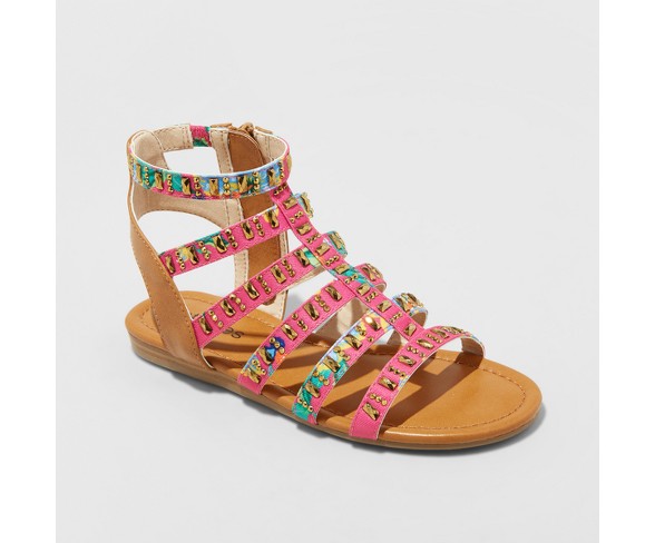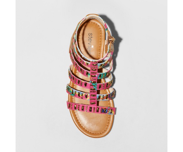 Description Your fashion-forward girl will be ready to wear her warm-weather looks when she can pair them with MoveNight Embellished Gladiator Sandals from Stevies. These pink gladiator sandals are embellished with gold metal accents on the straps for a look that shines. The versatile style is perfect to pair with skirts, dresses and shorts, and with the zip-up closure, she can trust the secure fit while she explores her surroundings.Sizing: KidsCare and Cleaning: Clean with mild detergentLining Material: PolyurethaneInsole Material: Man made materialsFeatures: Ankle strap, Zipper, Open toeUpper Shoe Material: 65% Polyester and 33% PolyurethaneSole Material: 58% Polyester and 42% TPR (thermoplastic rubber)Heel: No heelFootwear outsole details: Textured outsoleShoe Width: MediumFootwear upper material 3: PlasticGirls' gladiator sandals with gold dot and bar embellishmentsZip closure along the inside of the ankle offers her a secure fitBrown faux leather on the footbed and ankle straps add a chic touch Estimated shipping dimensions: 6.1INCH X 4.4INCH X 11.2INCH DPCI : 093-09-2700 UPC : 490930927001 TCIN : 52913189 Estimated shippimg weight: 1.1POUND