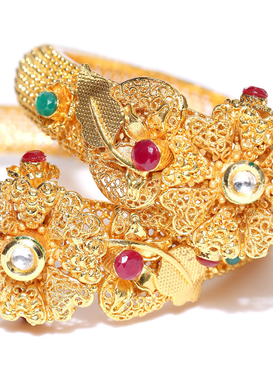 Product Details Set of two bangles in gold-toned, red and green with stone-studded and textured detailEach secured with a screw closureSize & FitDiameter: 6.5 cm (each)Material & CareMetal and artificial stones Wipe with a clean cotton swab when neededSpecificationsOccasionEthnicStone TypeArtificial Stones and BeadsComplete The LookThese bangles from damani pack the right punch of feminine elegance and glamour to accessorise an evening look. Wear them with embroidered saree and metallic heels.