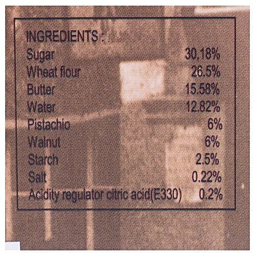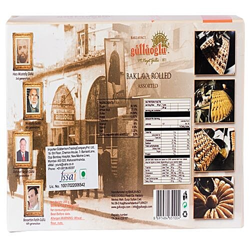 About @import url("https://www.desercart.com/static/froala_style_v2.min.css"); The traditional and the very famous sweetness from the era of the Ottoman empire, baklava, has made a lasting impression in the hearts and souls of all dessert lovers across the globe. Turkish baklava is a thin and crispy layer of filo pastry piled on top of each other, ladened with butter and a special syrup to give it that crispy rich texture and stuffed with a wholesome stuffing of the finest pistachio, walnuts, hazelnuts etc. from the land of Turkey. Enjoy Gulluoglu Vaha Rolled Assorted Baklava to tame your sweet tooth. Ingredients @import url("https://www.desercart.com/static/froala_style_v2.min.css"); 100% Veg, Wheat Flour, Butter, Sugar Syrup, Walnuts How to Use @import url("https://www.desercart.com/static/froala_style_v2.min.css"); The rich and the luxurious desert of the Ottoman is imported all the way just to satiate your sugar cravings.