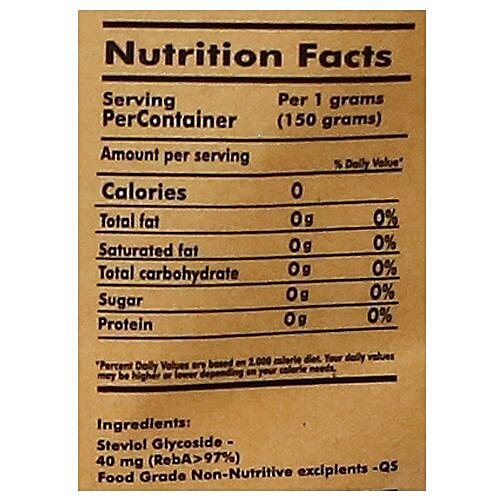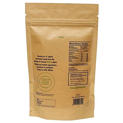 About @import url("https://www.desercart.com/static/froala_style_v2.min.css"); Zerovia is a zero calorie natural sugar substitute made from the extracts of the Stevia plant. These sweeteners are healthy, natural sweeteners which help in regulating blood sugar levels. Zerovia guarantees 100% sweetness with zero calories which helps in controlling blood sugar levels. You can sprinkle some in your coffee/tea or even bake with it and stir into your breakfast cereals. 1 sachet of Zerovia = 2 Teaspoon of sugar. Composition @import url("https://www.desercart.com/static/froala_style_v2.min.css"); Steviol Glycoside-40mg(RebA>97%)
