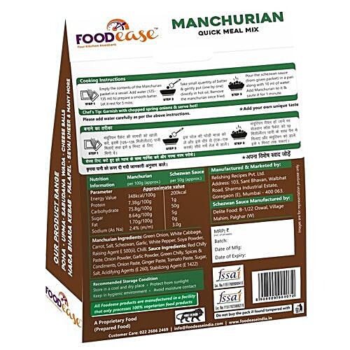 About @import url("https://www.desercart.com/static/froala_style_v2.min.css"); Manchurian is a delicious Chinese dish and consist of delicious, melt in mouth vegetable balls, dunked in spicy, aromatic gravy. The net result is a delightful burst of flavours on the tongue and ready to eat lip smacking quick meal. Pair it with fried rice, noodles or plain rice and with your whole family. No wonder its people favourite Chinese Dish Ingredients @import url("https://www.desercart.com/static/froala_style_v2.min.css"); Refined Wheat Flour, Corn Starch, Green Onions, White Cabbage, Carrot, Salt, Schezwan Powder, Garlic, White Pepper, Soya Powder, Raising Agent E500(Ii), Chilli How to Use @import url("https://www.desercart.com/static/froala_style_v2.min.css"); Add water to the contents of the pack as per the instruction. Pick small quantity of batter and gently put in hot oil. Pour the schewan sauce from given packet in a pan along with 10 ml of water and saute it. The chefs suggests to garnish with chopped spring onions & server hot!