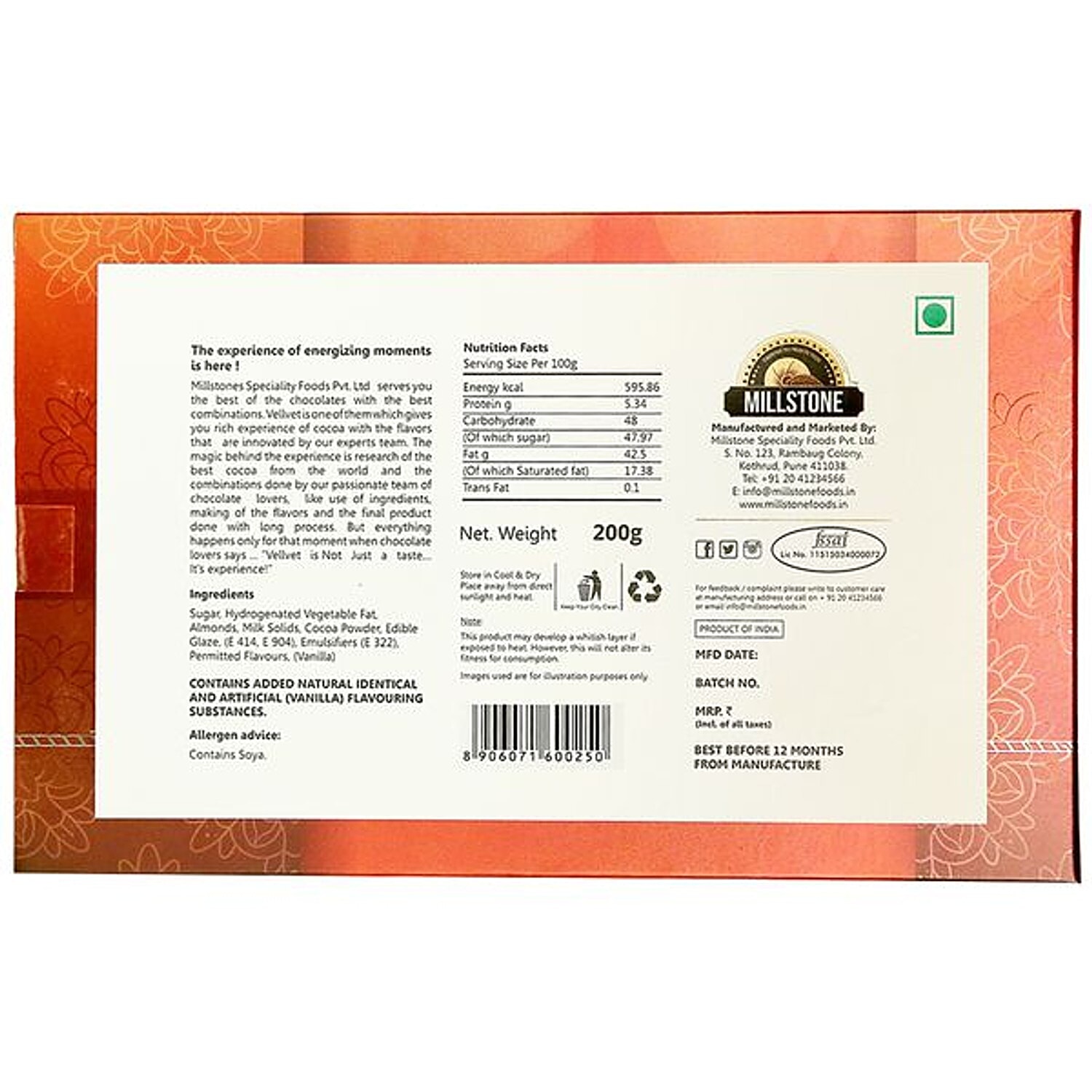 About @import url("https://www.desercart.com/static/froala_style_v2.min.css"); Millstone speciality foods Pvt ltd serves you the best of the chocolates with the best combinations. Vellvet is one of them which gives you the rich experience of cocoa with the flavours that are innovated by our expert team. The magic behind the experience is research of the best cocoa from the world and the combinations done by our passionate team of chocolate lovers, like the use of ingredients, making of the flavours and the final product done with the long process. But everything happens only for that moment when chocolate lovers say. Vellvet is not just a taste, its an experience. Ingredients @import url("https://www.desercart.com/static/froala_style_v2.min.css"); Sugar, Hydrogenated Vegetable Fat, Almonds, Milk Solids, Cocoa Powder, Edible Glaze, (E 414, E904), Emulsifiers (E 322), Permitted Flavours, (Vanilla