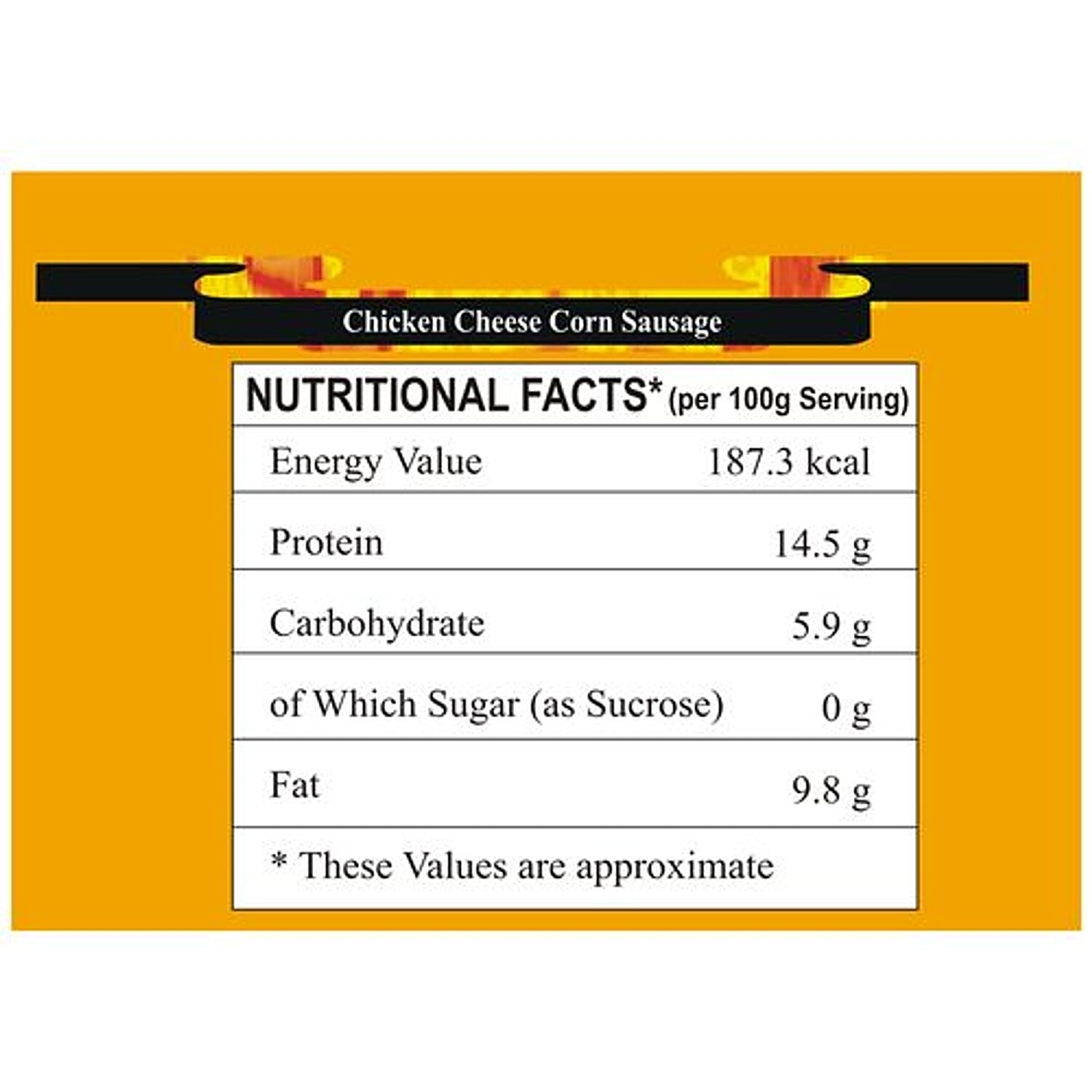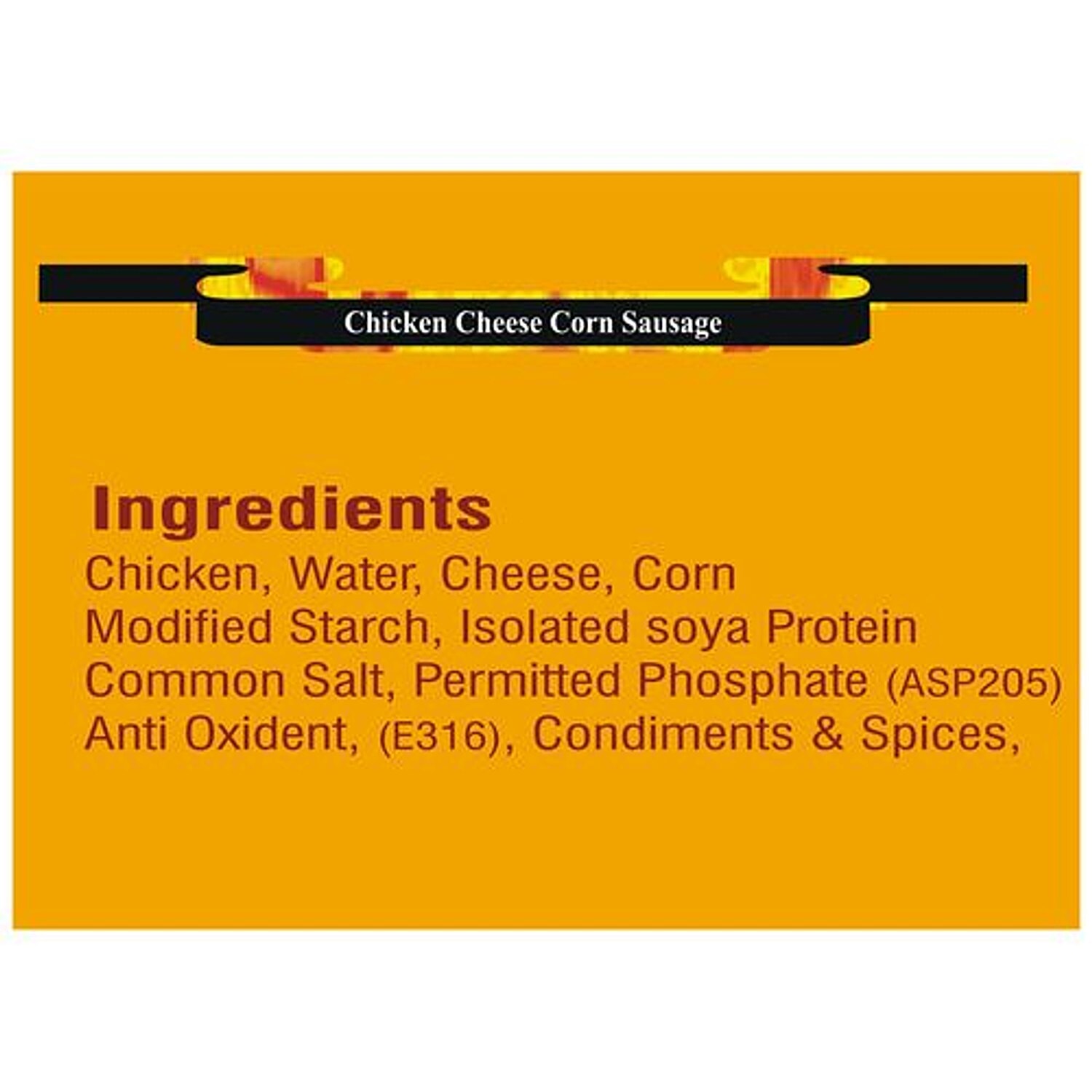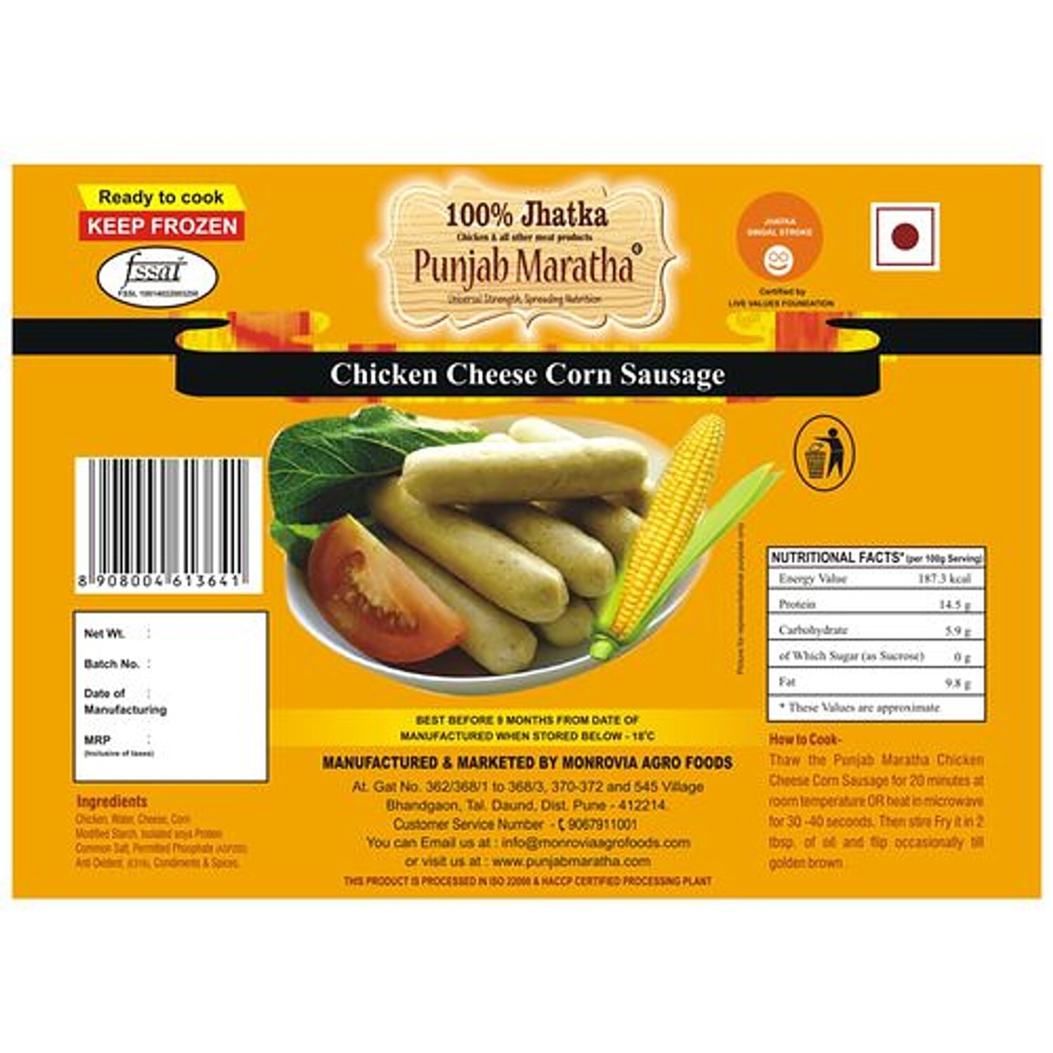 About the Product @import url("https://www.desercart.com/static/froala_style_v2.min.css"); Punjab Marathas Chicken Cheese Corn Sausage gives a cheese burst experience with every bite of the sausage. The cheese melts in the mouth while the corn in the sausage teases the taste buds. It is truly a divine sausage experience. The product is certified as free of rituals and torture (FORT) and is processed at an ISO 22000 and HACCP certified processing plant. Ingredients @import url("https://www.desercart.com/static/froala_style_v2.min.css"); Chicken, Water, Cheese, Corn Modified Starch, Isolated Soy Protein, Common Salt, Permitted Phosphate (asp205), Anti Oxidant(e316), Condiments & Spices. How to Use @import url("https://www.desercart.com/static/froala_style_v2.min.css"); Thaw the Punjab Maratha Chicken Cheese Corn Sausage for 20 minutes at room temperature or heat in microwave for 30-40 seconds.Then stir fry it in 2 tbsp. of oil and flip occasionally till golden brown.