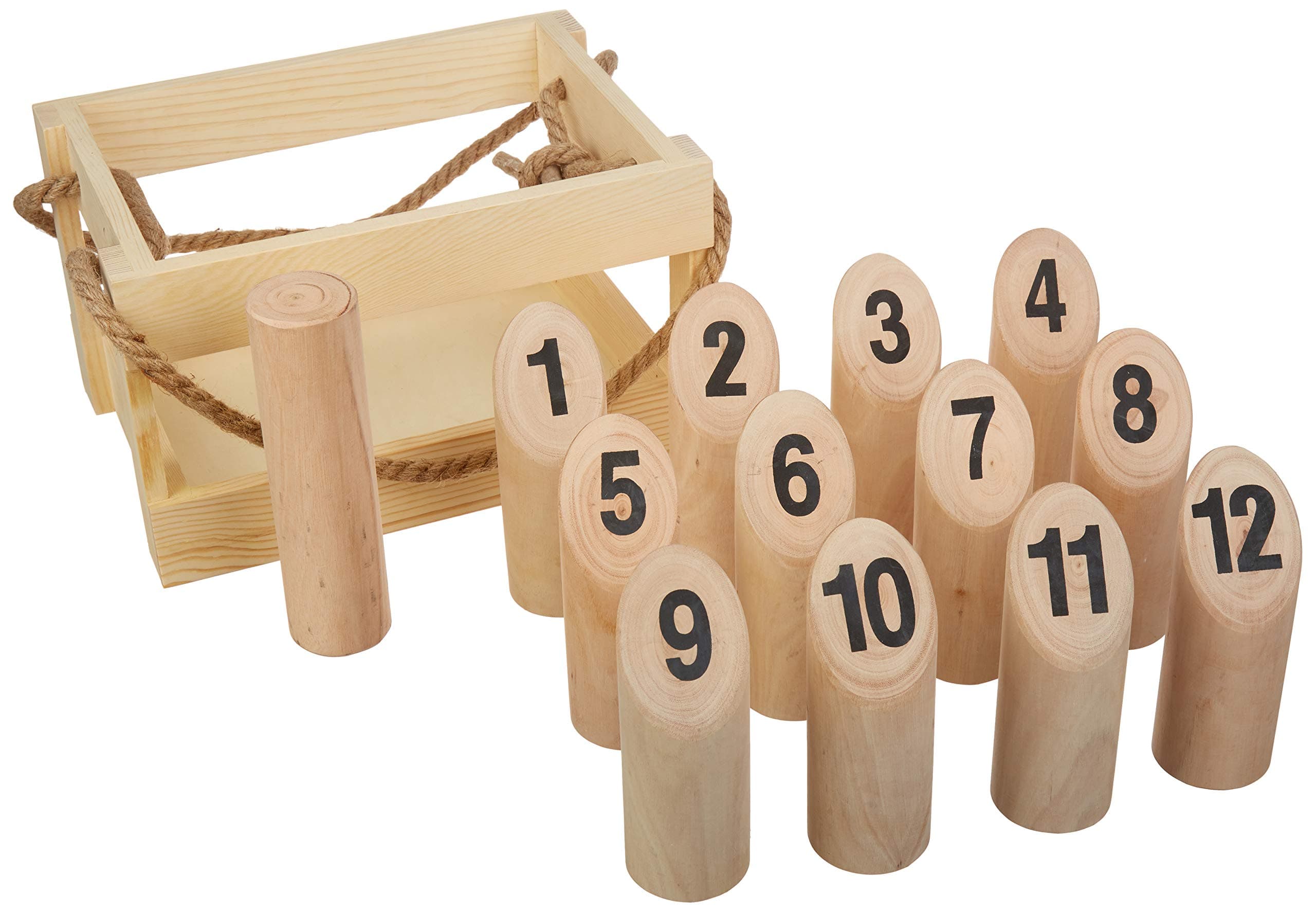 The Amazon Basics Kubb Game is a durable hardwood lawn game set designed for 2 or more players aged 6+, featuring 12 numbered pins, a throwing pin, scorebook, and a wooden carrying crate. Suitable for various outdoor surfaces, it combines skill and chance for addictive gameplay, backed by a 1-year limited warranty.