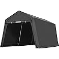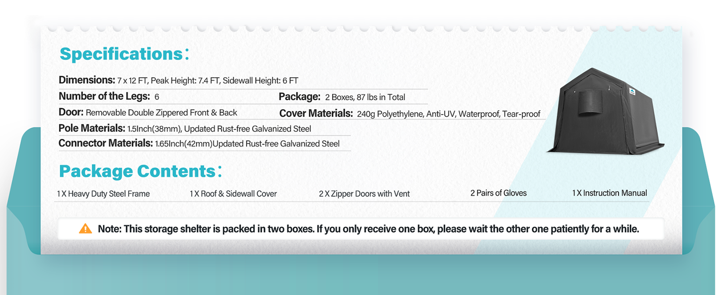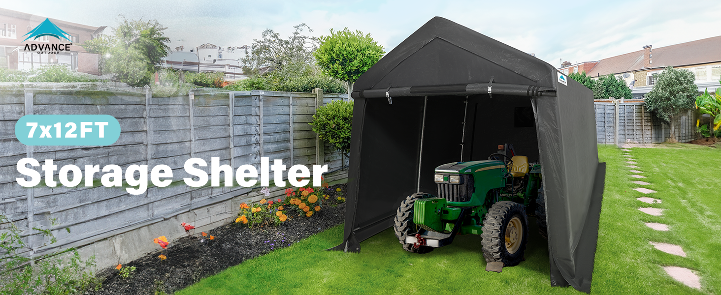 The ADVANCE OUTDOOR 7x12 ft portable storage shelter features dual removable roll-up doors with double-layer vents for optimal airflow and moisture prevention. Its heavy-duty 1.5-inch steel frame and reinforced L-type pegs provide exceptional stability. The triple-layer 240g PE ripstop cover is UV-treated and weather-resistant, ensuring protection against sun, rain, snow, and wind. Easy to assemble without tools, this versatile shelter is ideal for motorcycles, ATVs, bikes, and small equipment, backed by a 1-year coverage on poles and canopy.
