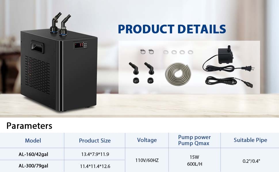 The Fitnet 79 Gal Aquarium Chiller is a high-efficiency cooling solution designed for both freshwater and saltwater environments. With a powerful 1/3 HP compressor, it maintains optimal water temperatures between 68°F-79°F (20°C-26°C) while operating quietly. This complete set includes a water pump and all necessary connectors, making it ideal for both novice and experienced aquarists. Plus, it comes with a 1-year guarantee for added assurance.