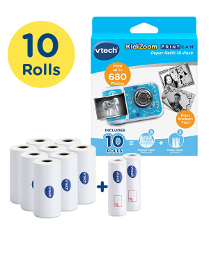The VTech KidiZoom PrintCam Paper Refill 10-Pack includes eight regular thermal paper rolls and two adhesive sticker paper rolls, allowing for instant black-and-white photo printing and sticker creation. Each regular roll can print up to 80 photos, while the adhesive rolls can produce 20 stickers, making it a perfect addition for creative kids aged 4 and up.