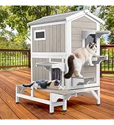 The PetsCosset Outdoor Cat Shelter is a sturdy, two-story wooden house designed for feral or outdoor cats. Featuring a weatherproof sloped asphalt roof, elevated base, and dual access doors including an escape hatch, it offers year-round protection and safety. Its modular interior allows flexible use as separate feeding and resting areas or one large space. Easy to clean with sliding floors and an openable roof, it supports DIY winter insulation for added warmth. Ideal for 1-2 small cats, this shelter combines durability, comfort, and convenience in a stylish grey-white finish.