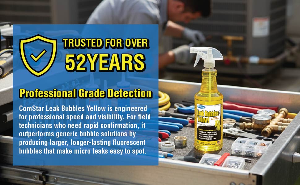 ComStar Leak Bubbles Yellow is the fastest-acting, non-toxic spray leak detector designed to identify micro leaks in natural gas, refrigeration gases, nitrogen, air, and CO2. Its long-lasting bubbles and freeze-resistant formula ensure reliable performance in any environment. Proudly made in the USA, this 1-quart spray offers professional-grade leak detection with safety and precision.