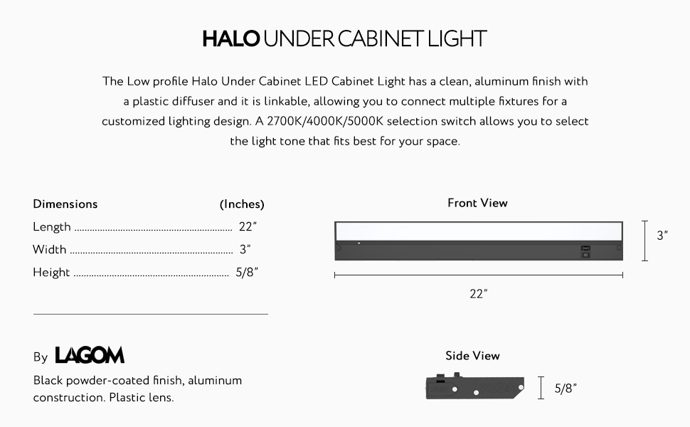The LAGOM Halo Under Cabinet Light is a 22-inch, hardwired or plug-in LED fixture featuring three adjustable color temperatures (2700K, 4000K, 5000K) with a high CRI of 90 for true-to-life color rendering. Delivering 880 lumens at just 12 watts, it supports linking up to 15 units for continuous lighting runs. Its sleek, low-profile black aluminum design is dimmable via standard wall switches and ETL-listed for damp locations, making it a versatile, durable choice for modern kitchens and workspaces.