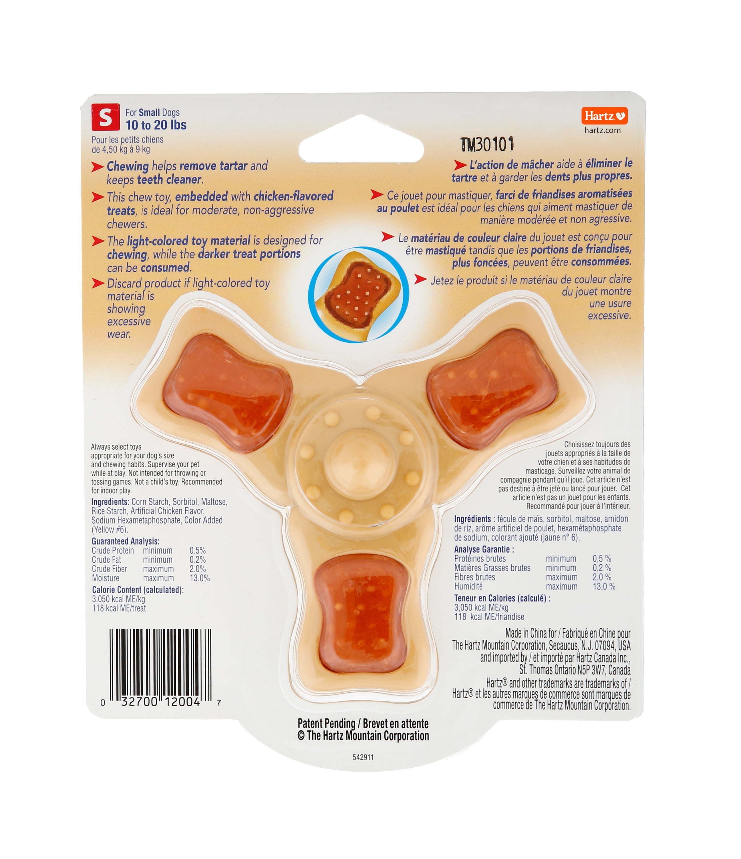 Hartz Chew ‘n Clean Tri-Point dog chew toy and treat in one satisfies your dog’s desire to chew! This dog toy has a durable nylon exterior is embedded with chicken-flavored treats for moderate chewers. The dog toy has shape contours and nubs that help keep teeth clean, remove tartar while also gently massaging your dog’s gums. The fun and functional tri-point shape is designed to be easy for small dogs to hold and grasp. Always supervise your pup and select appropriate toys for both your dog’s size and chewing habits. Small Dog Chew Toy & Treat in One Embedded Chicken-Flavored Treats Easy to grip shape Dental benefits For moderate, non-aggressive chewers