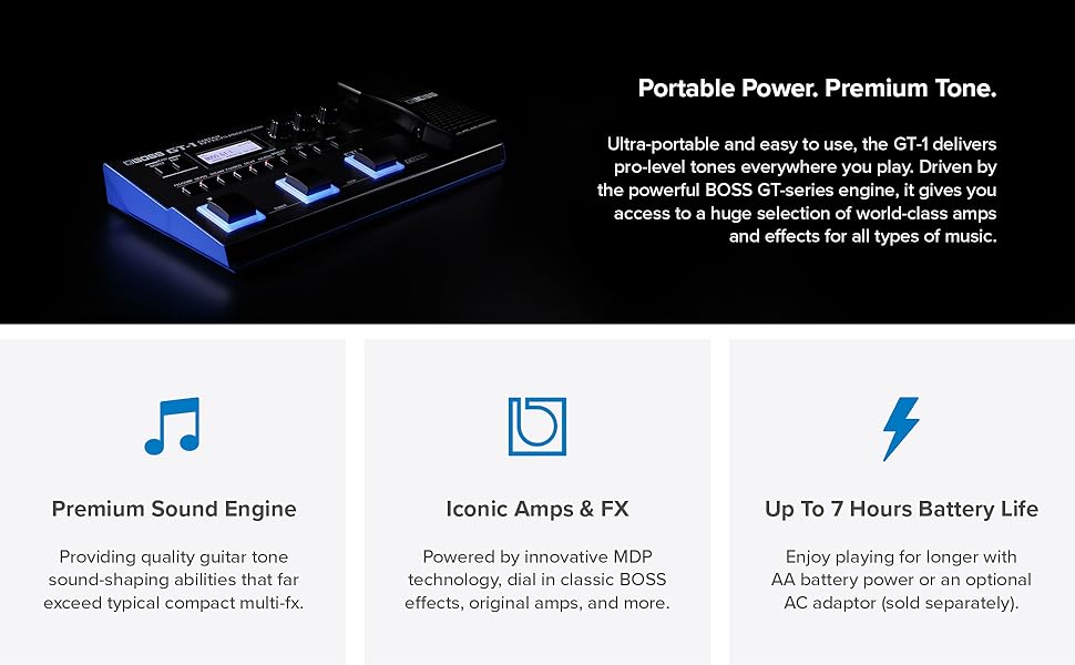 The BOSSGT-1 is a lightweight, compact guitar effects processor featuring the flagship BOSS GT-series sound engine. It offers a vast selection of amps and effects, intuitive Easy Select and Easy Edit functions, and real-time control via an assignable switch and expression pedal. Powered by 4 AA batteries for up to 7 hours of playtime, it’s designed for portability and professional performance, with USB connectivity for patch downloads and updates.