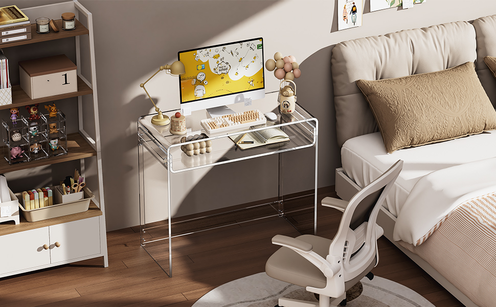 This modern acrylic desk features a crystal-clear, polished surface measuring 33.5'' x 15.7'' x 29.5'', designed for compact spaces. It supports up to 50 pounds, includes a single drawer, and offers versatile use as a laptop or console table. Easy to assemble with included hardware, it blends seamlessly with contemporary furniture for a stylish, functional home office upgrade.