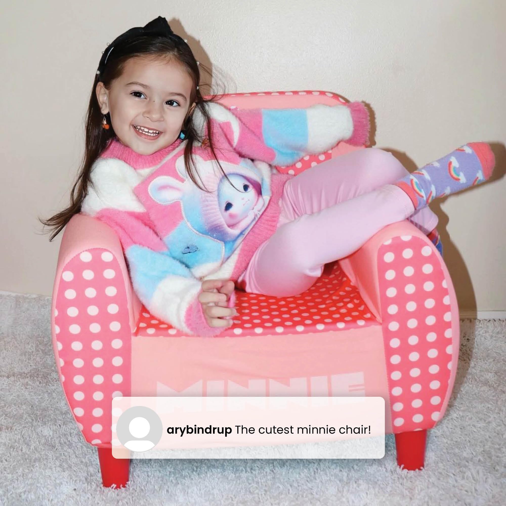 The Delta Children Disney Minnie Mouse Foam Chair is a cozy, stylish seating option for kids aged 3 and up. With a weight capacity of 100 lbs, this chair features adorable Minnie Mouse graphics, a high back, and padded arms, making it the perfect spot for reading, watching TV, or just relaxing. Its modern wood feet ensure it fits beautifully in any room, while meeting all safety standards set by the CPSC.