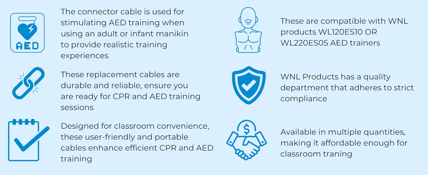 The WNL Products XFT-YC-4Pack Replacement Connector Cables are essential for simulating AED training with adult manikins. This set includes two durable and reliable cables designed for seamless compatibility with WNL AED Trainer models WL120ES10 and WL220ES05, ensuring you are always prepared for effective CPR and AED training sessions.