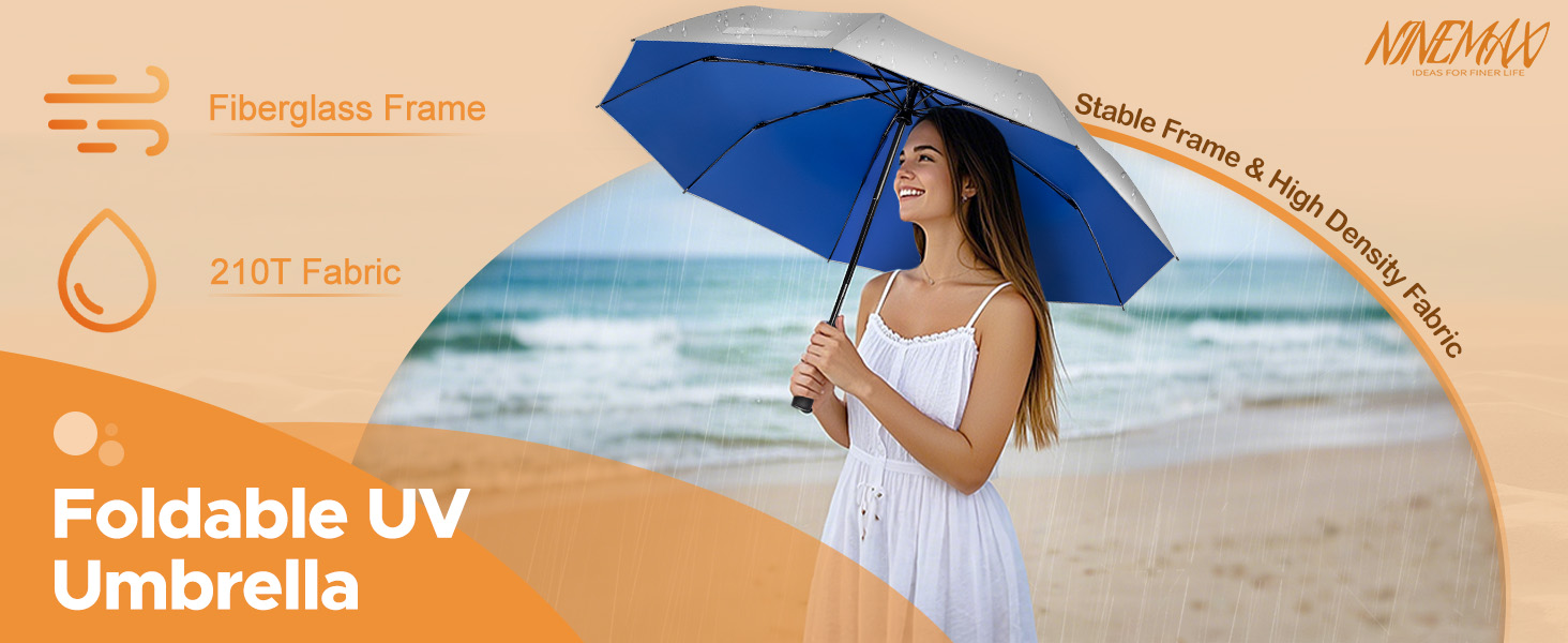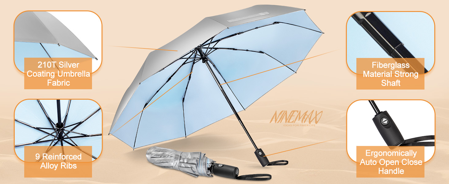 The NINEMAX UV Umbrella combines cutting-edge UPF 50+ sun protection with a durable, windproof design and one-button automatic open/close functionality. Its compact 12-inch fold and lightweight 372g build make it the ideal travel companion for millennials balancing busy urban lifestyles. Engineered with premium 210T waterproof fabric and reinforced fiberglass ribs, it offers reliable defense against harsh sun rays, sudden rain, and strong winds up to 60 mph.