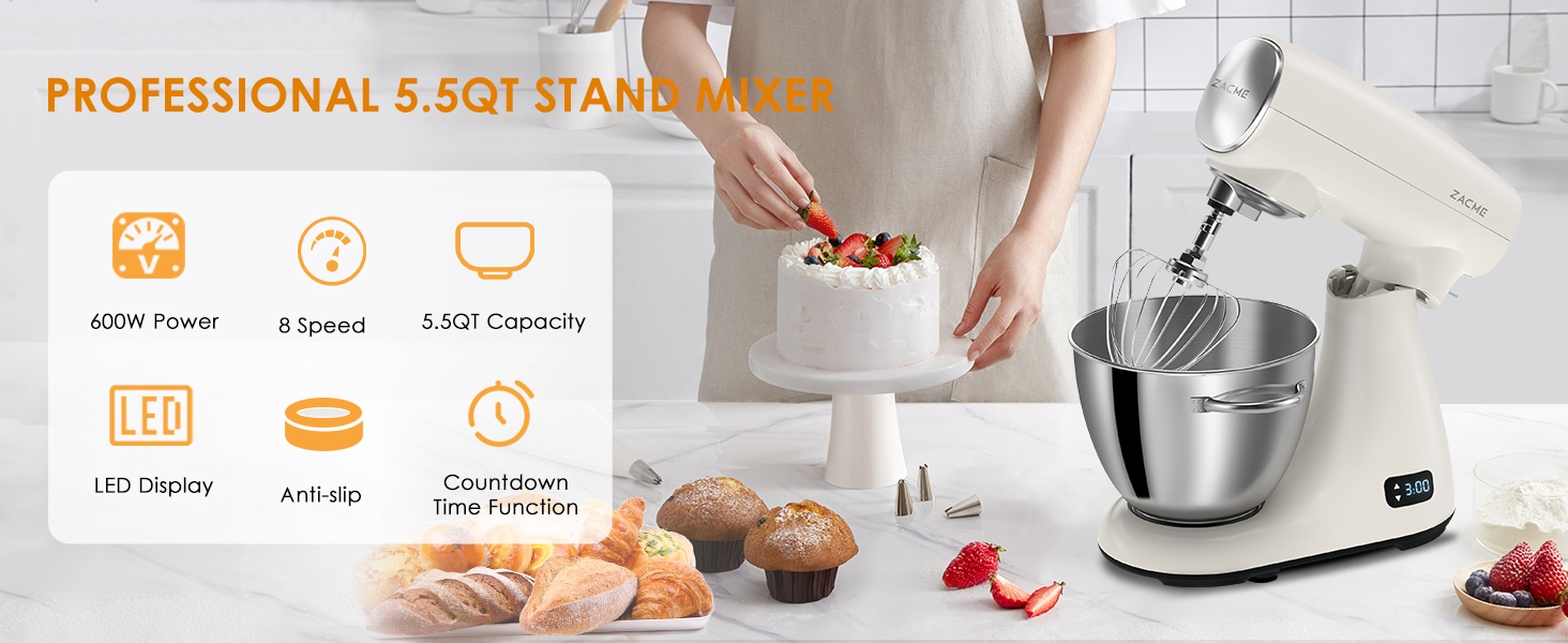 ZACME - Stand Mixer, 8 Speed, Kitchen Stand Mixer with 5.5 Quart Stainless Steel Bowl, 600W Tilt-Head Kitchen Food Mixers with Hook