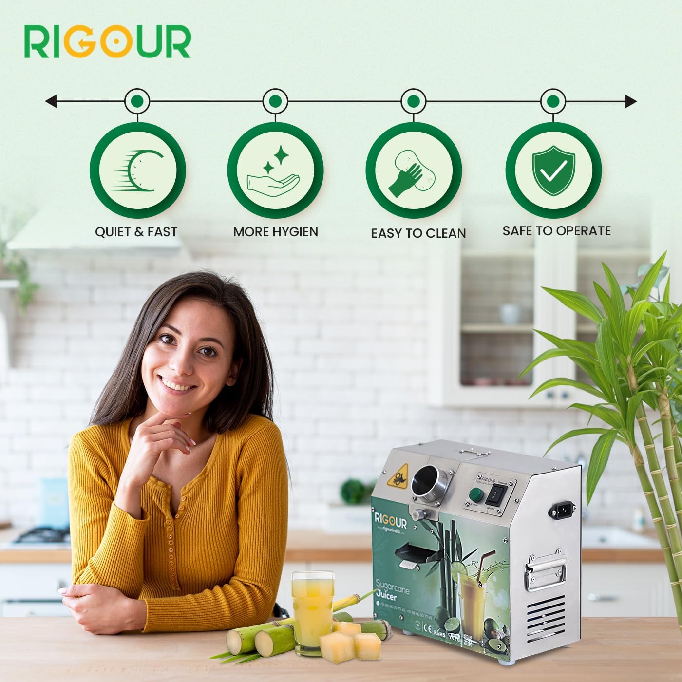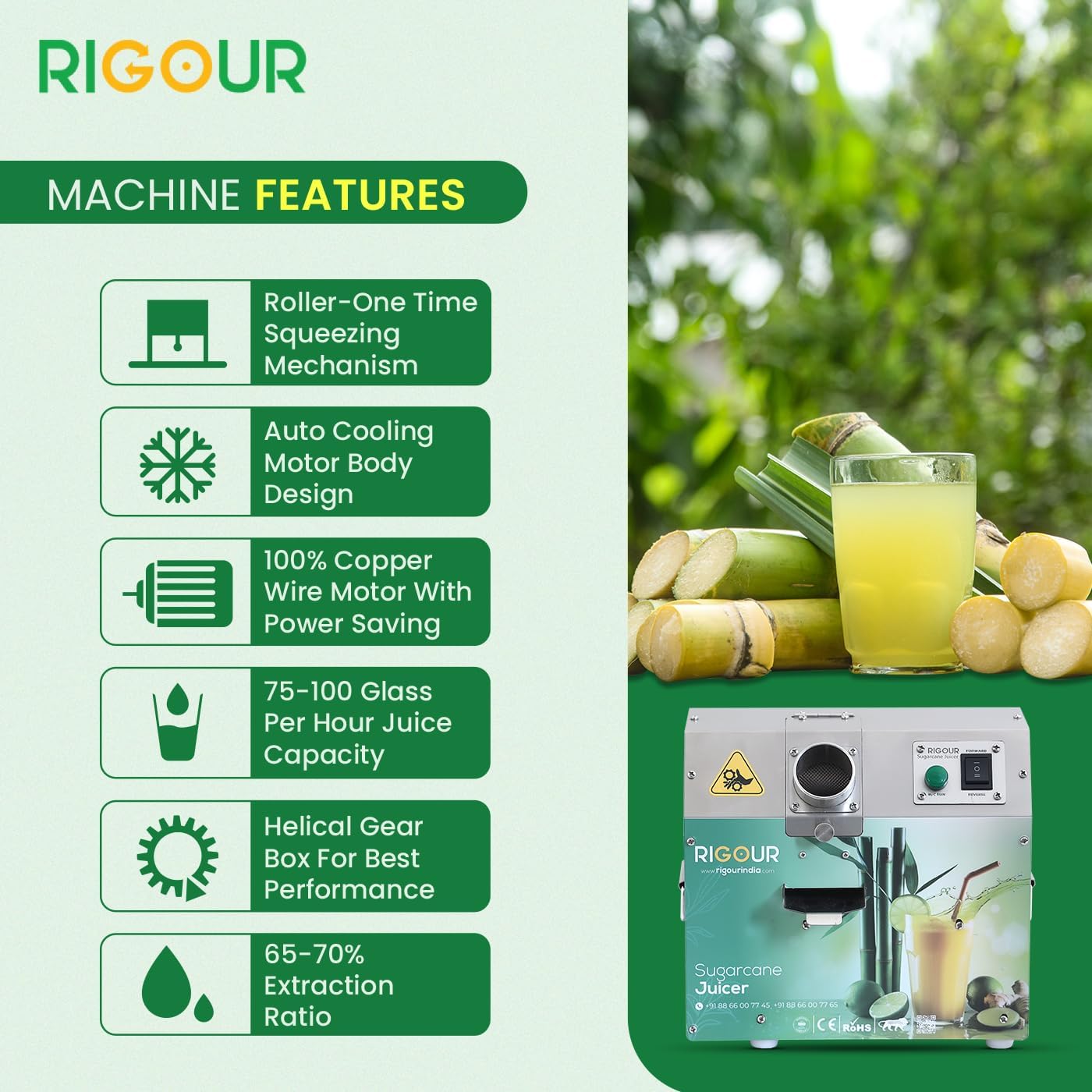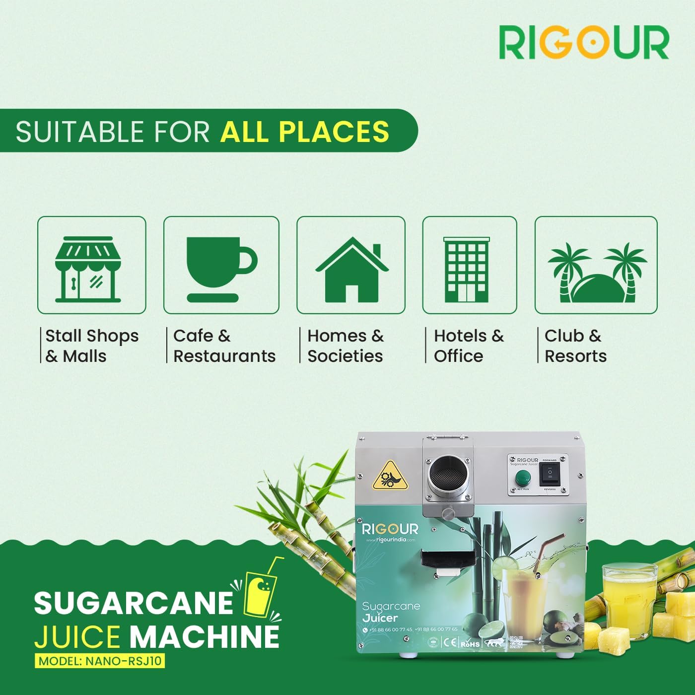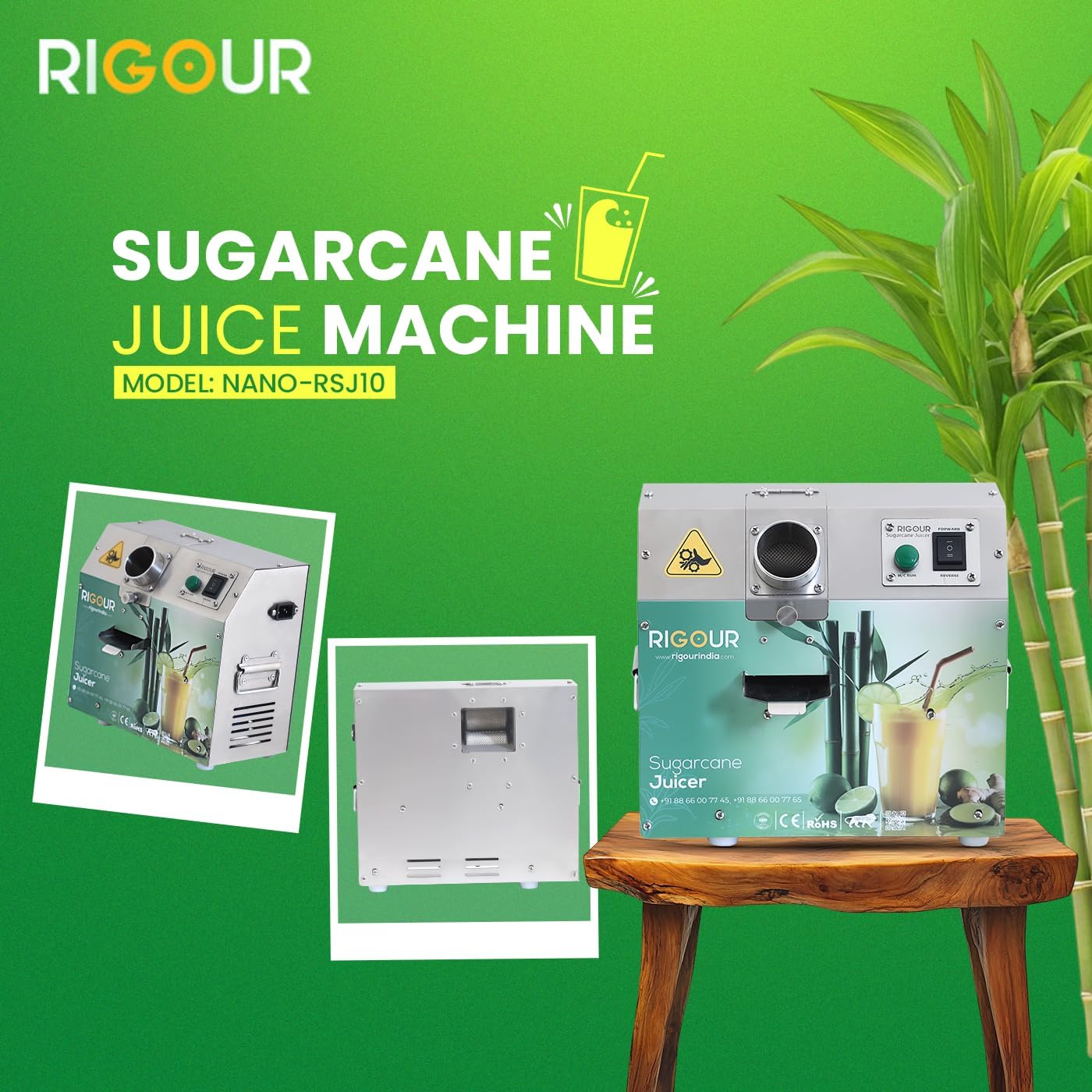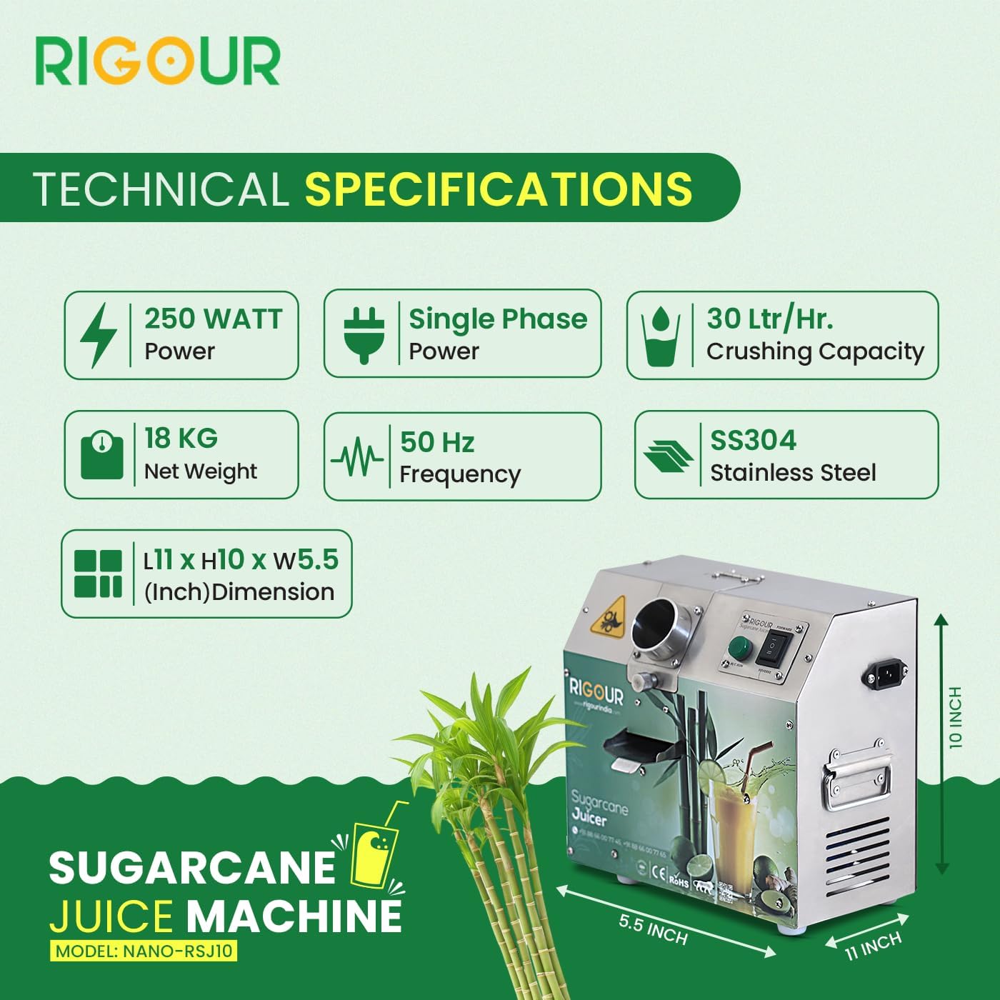 The Rigour RSJ10 Nano Sugarcane Juicer combines industrial-grade 304 stainless steel construction with a powerful 250W single-phase motor, delivering up to 30 liters of fresh sugarcane juice per hour. Its compact, portable design and 2-year warranty make it the perfect choice for professional juice vendors and health-conscious entrepreneurs seeking durability, efficiency, and consistent high performance.